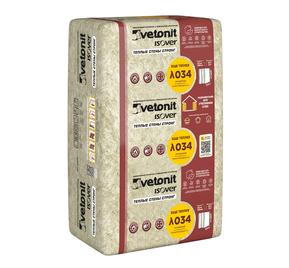 Vetonit (ISOVER) Теплые Стены Стронг— это усиленная каменная вата для систем тонкослойной штукатурки и фасадного утепления, с высокой механической прочностью. Плиты толщиной 50 мм, размерами 610×1000 мм, имеют продольные кромки Е (утолщённые) и К (четверть), что упрощает монтаж без холодных мостиков.