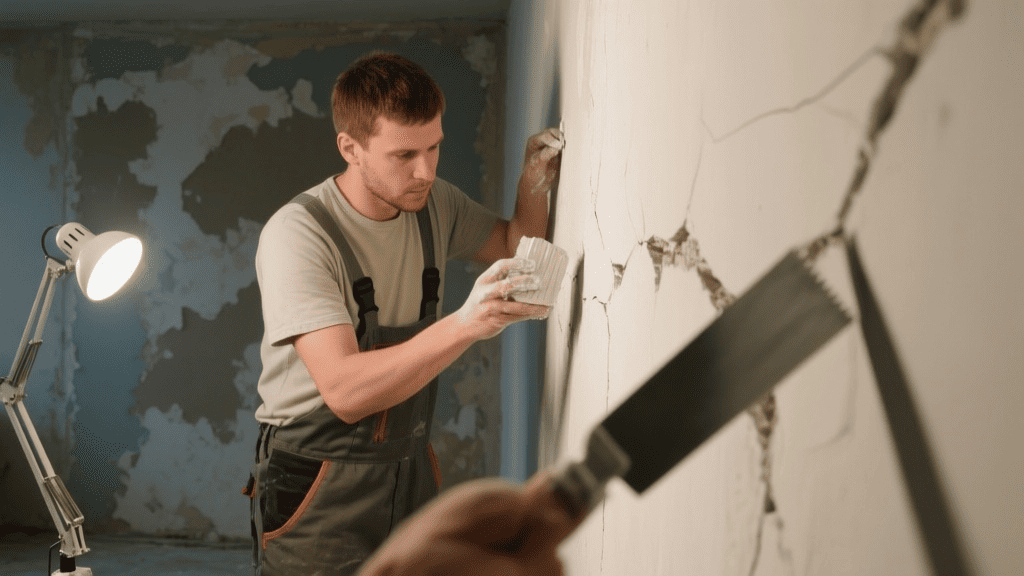 Далее осмотрите основание на наличие дефектов. Все трещины, сколы и выбоины нужно заделать подходящей шпатлевкой или ремонтным составом. После полного высыхания отремонтированные участки следует зашлифовать наждачной бумагой вровень с основной стеной, чтобы добиться гладкости.