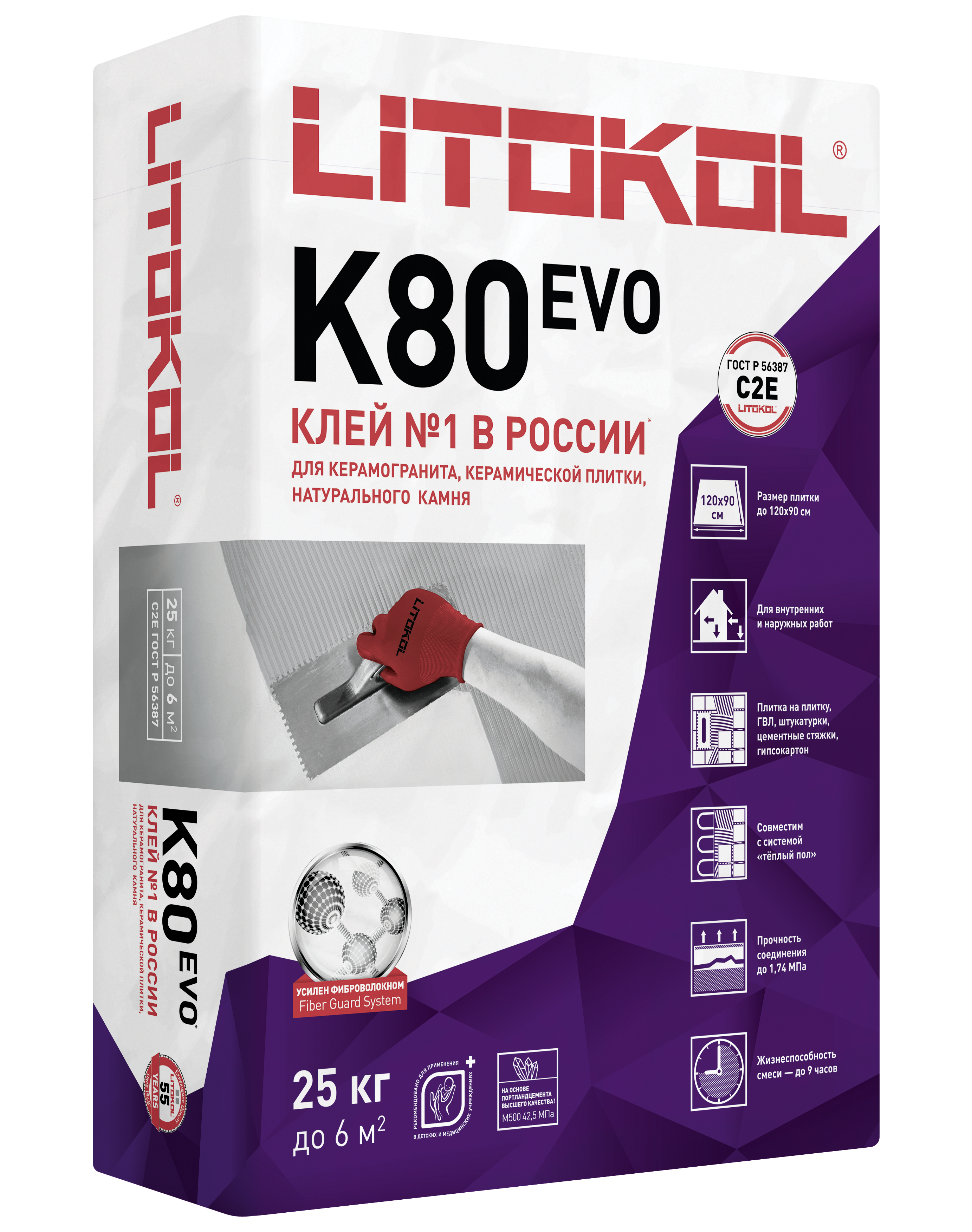 Клей для керамогранита,камня,плитки LITOKOL LITOFLEX K80 EVO фиброармированный С2 Е 25кг (54под)