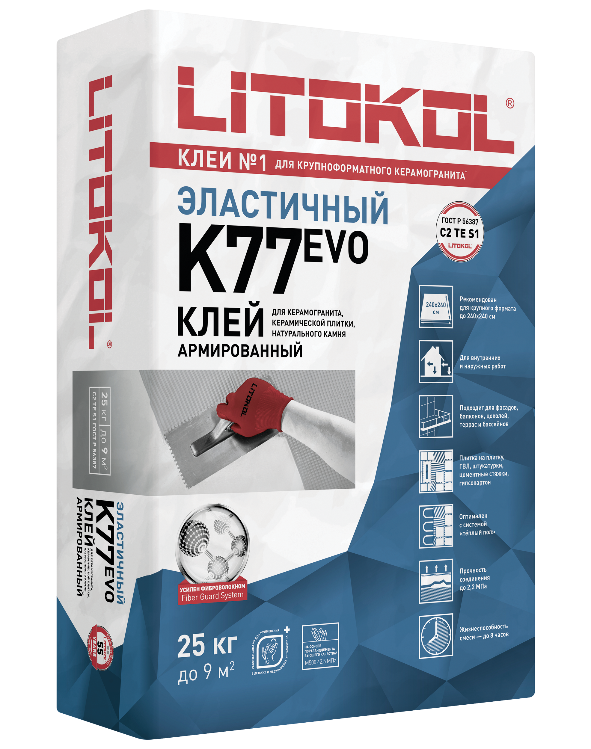 Клей для керамогранита,камня,плитки LITOKOL SUPERFLEX K77 EVO фиброармированный С2 ТЕS1 25кг (54под)